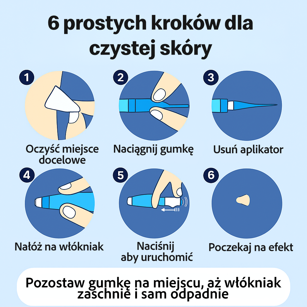 Instrukcja jest prosta i intuicyjna – cały proces zajmuje tylko kilka minut. Wystarczy oczyścić skórę, nałożyć gumkę i pozwolić jej działać. Bez bólu, bez skomplikowanych zabiegów i bez potrzeby wizyty u lekarza. DermaClip jest bezpieczny, wygodny i skuteczny – idealne rozwiązanie dla osób, które chcą szybko i dyskretnie pozbyć się włókniaków w domowym zaciszu.